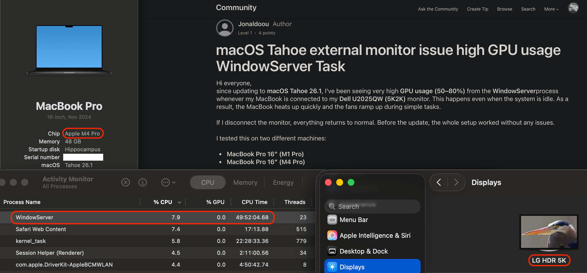 macOS Tahoe external monitor issue high GPU usage WindowServer Task