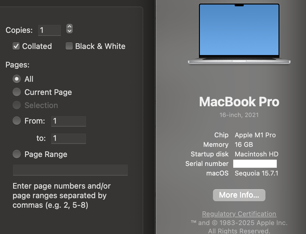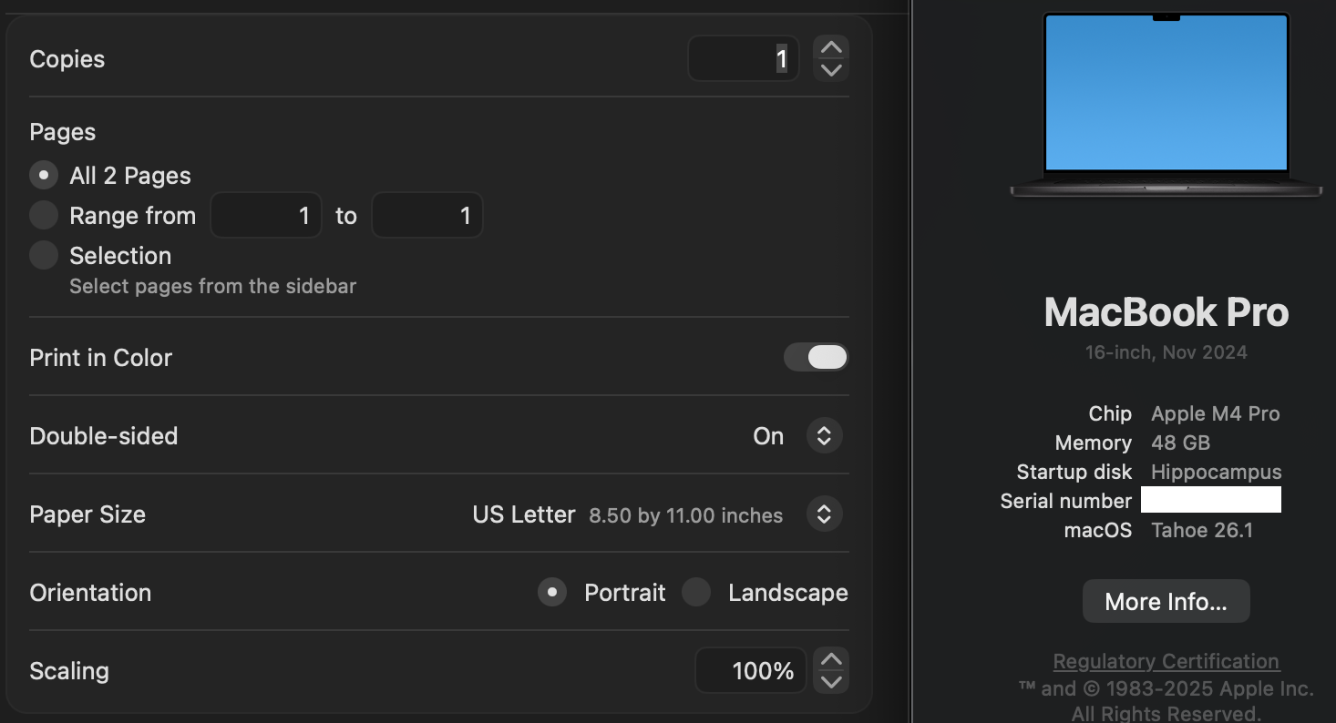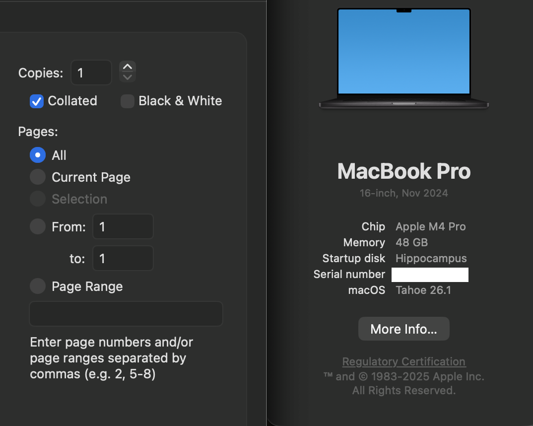Print Dialog options changed under Tahoe 26.1.