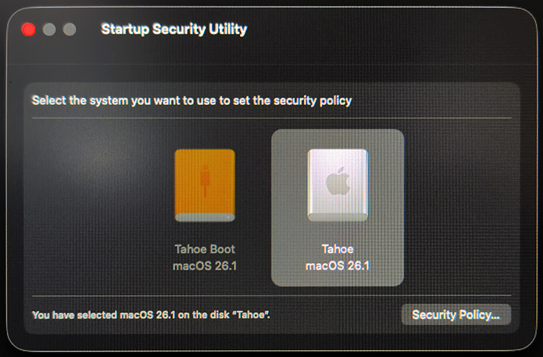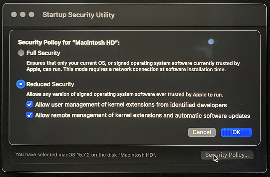 The internal drive is still the pre-boot volume (automatically selected), but the firmware is giving me the option to change it to the external drive, if I wanted to do that. Since I didn't, I clicked Security Policy, which then goes to screen where you can choose Full or Reduced Security.