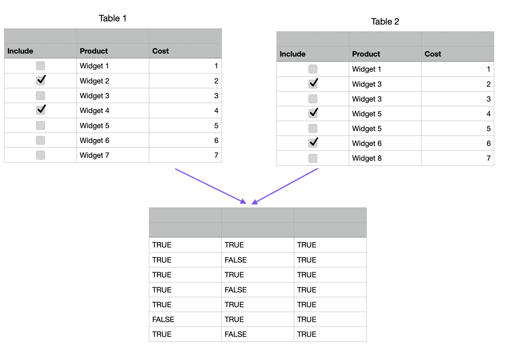 Initially this will result in a table of TRUE/FALSE values based on the cells' equivalence:
