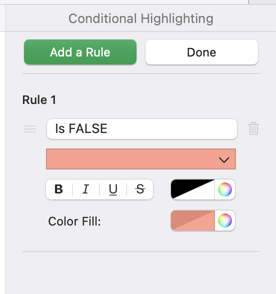 Now apply formatting to the cells. First, set the main text color to either white, or transparent (as you prefer). Then set a conditional format that changes the color of cells that are FALSE: