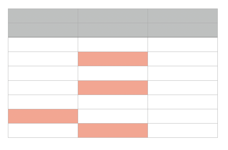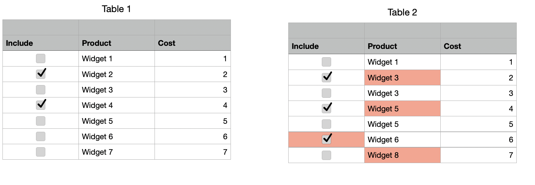 All you need to do now is position this table in the same position on the sheet as one of the other tables, and use the Inspector -> Arrange -> Back to send it behind the real table. This will have the effect of the differences 'poking through':