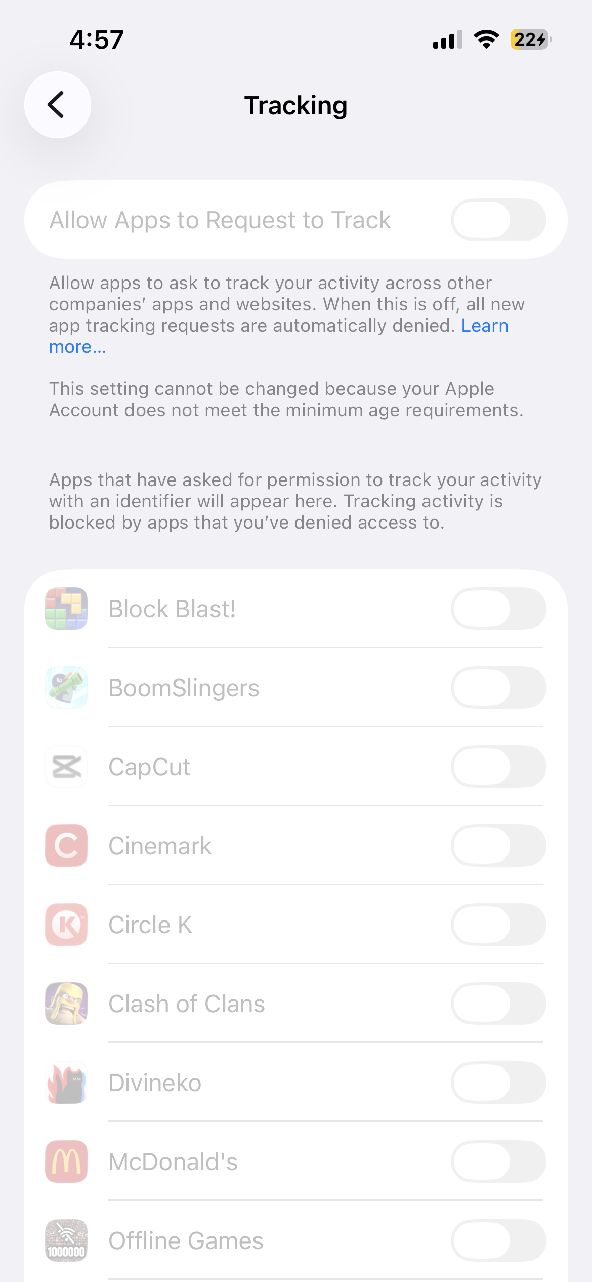 If you read the text right below the toggles, it tells you exactly why: "This setting cannot be changed because your Apple Account does not meet the minimum age requirements."