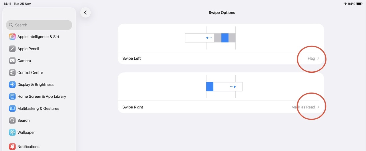 You can easily set the Mail swipe-gesture options in iPad settings - choosing your preferred actions from those available: