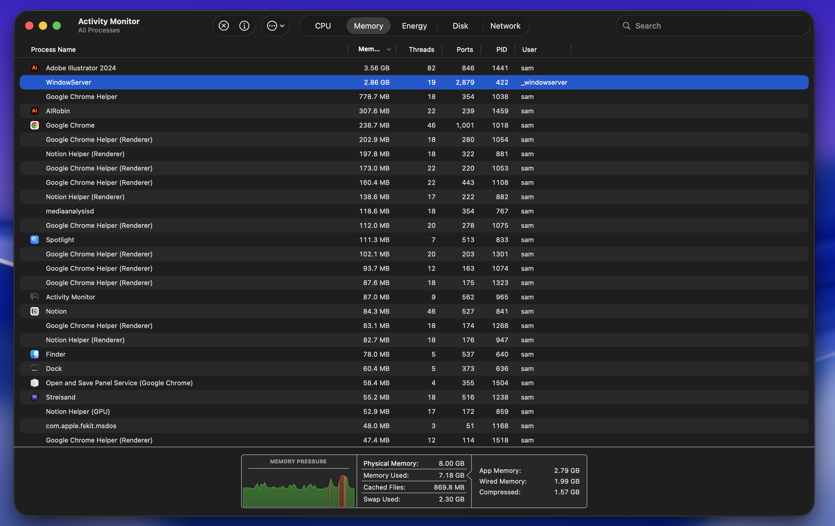 I'm not especially surprised by your screenshot for a Mac with 8 GB or memory that's running Illustrator and Chrome.