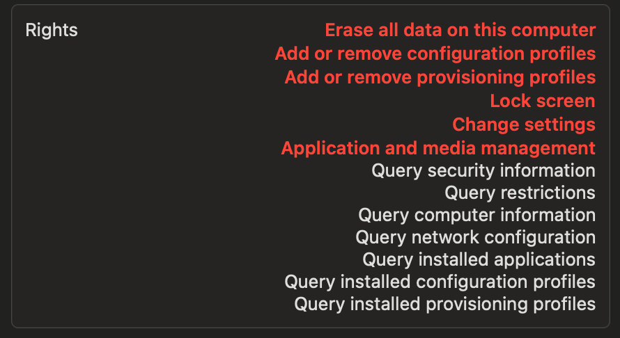 - The profile (.mobileconfig) says they have the following rights: