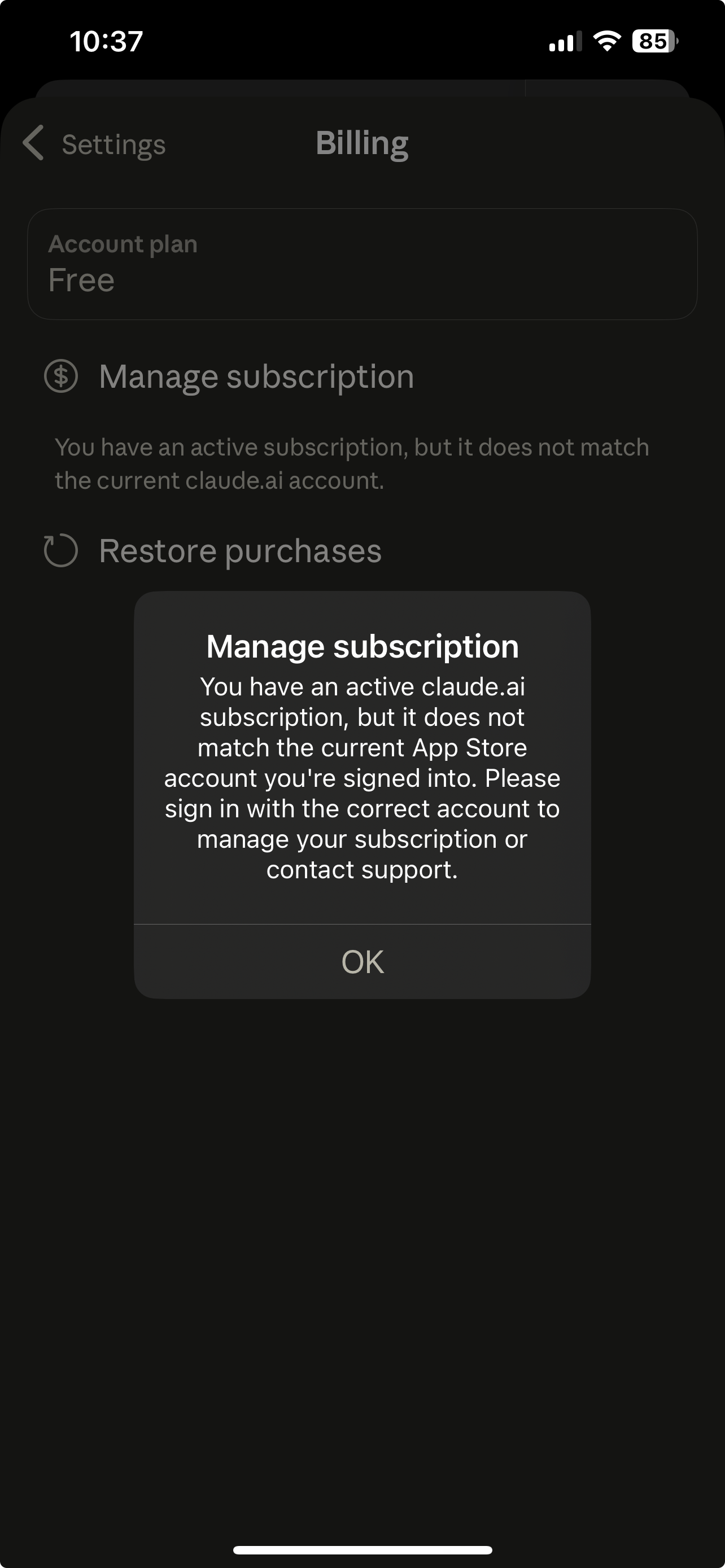 I subscribed to Claude pro plan from my iphone using app store and google pay. But it is not showing up on the app. I get the following error: you have an active subscription , but it doesn't match the current claude.ai account.