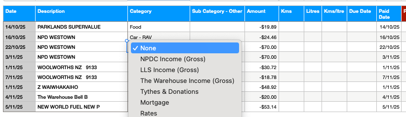Hi, I have a budgeting tool where I am able to extract a csv file for the bank and load the date, particulars and amount into my spreadsheet. Each transaction is categorised manually with a pop-up to improve data consistency e.g. Food, Electricity, Gas, etc etc.
