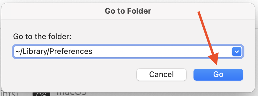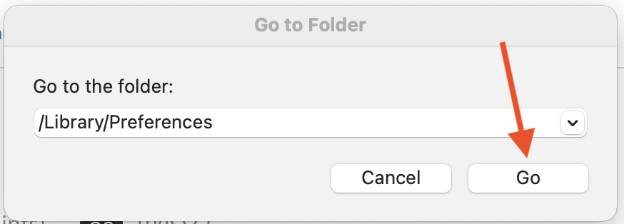 after that, go back to AppleMenu > Finder > Go and again choose "Go To Folder..." this time, in the popup, type in ~/Library/Preferences and click Go