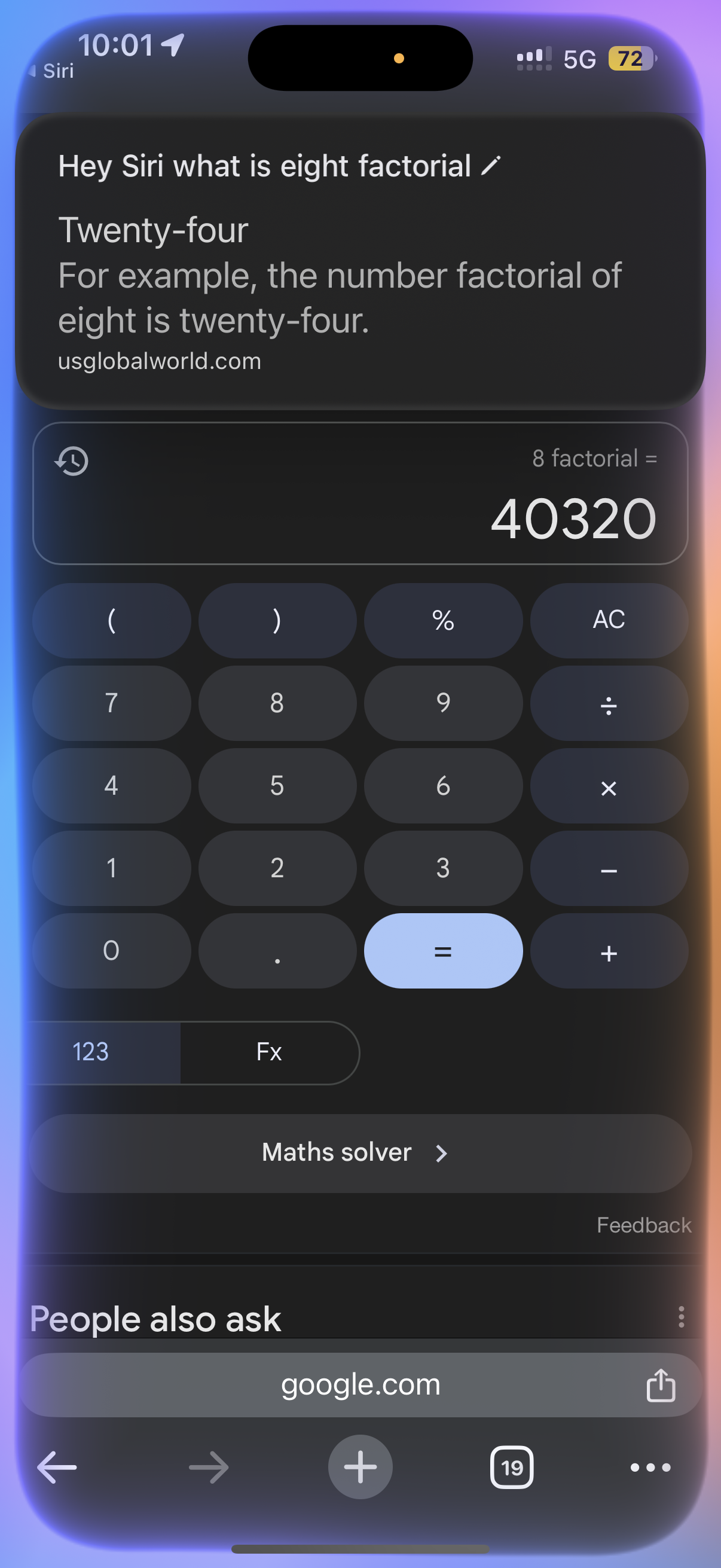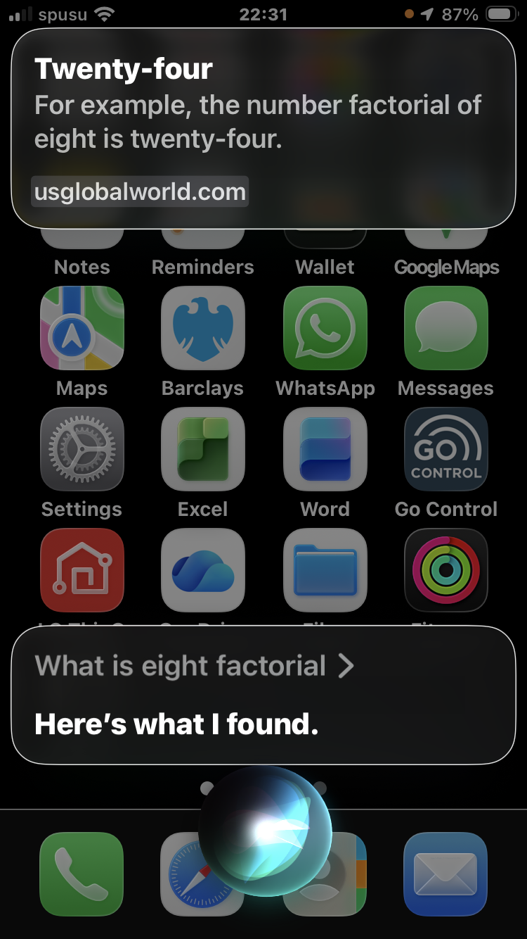 siri doesn’t really accept feedback and no button on the siri response for me to report this. I ask Siri what is eight factorial and she says 24. The site she refers to as source, is a parked domain at godaddy (no site). The real answer is 40320 which ChatGPT handles without issue. Pretty obvious error. Just saying.