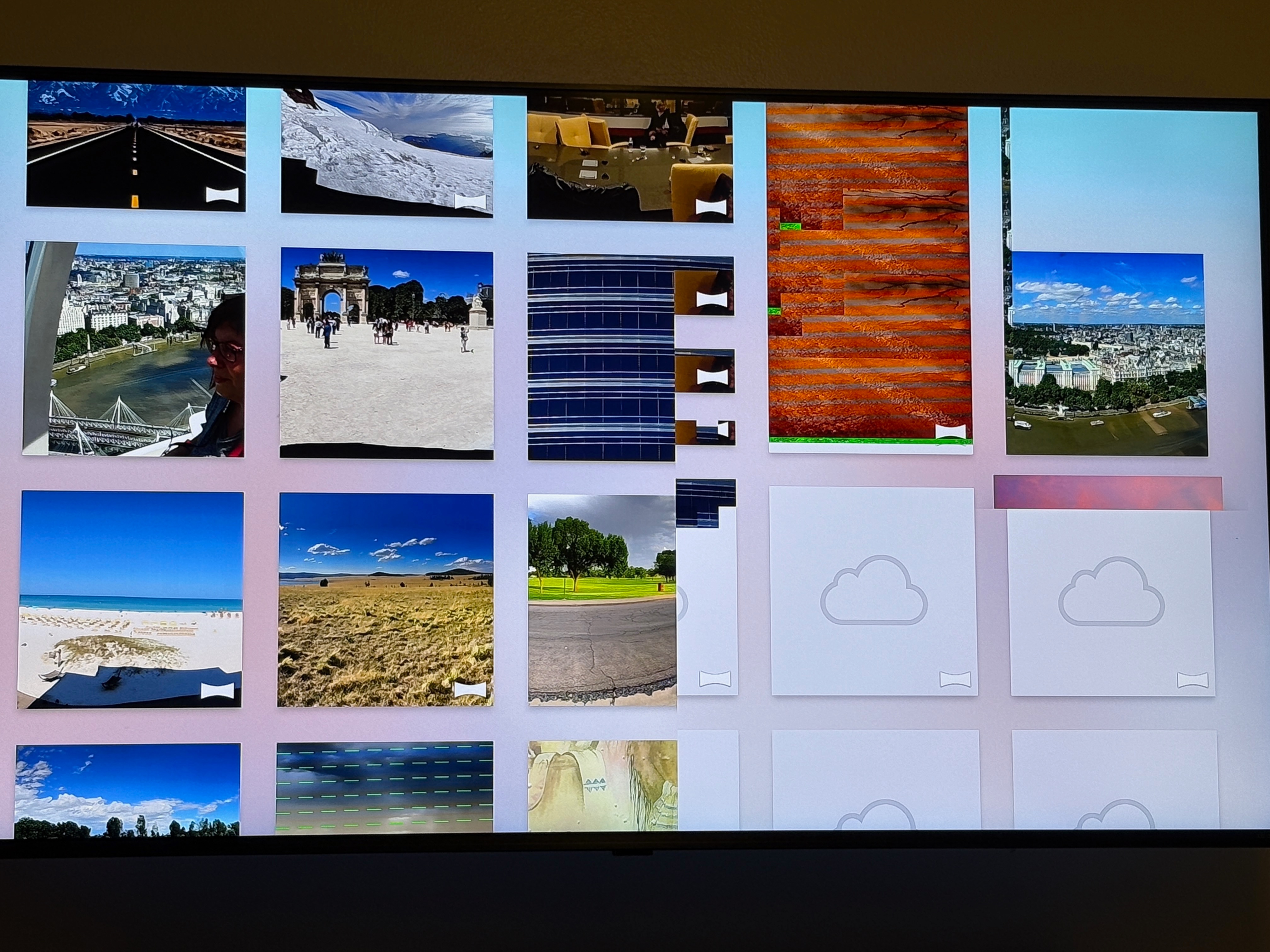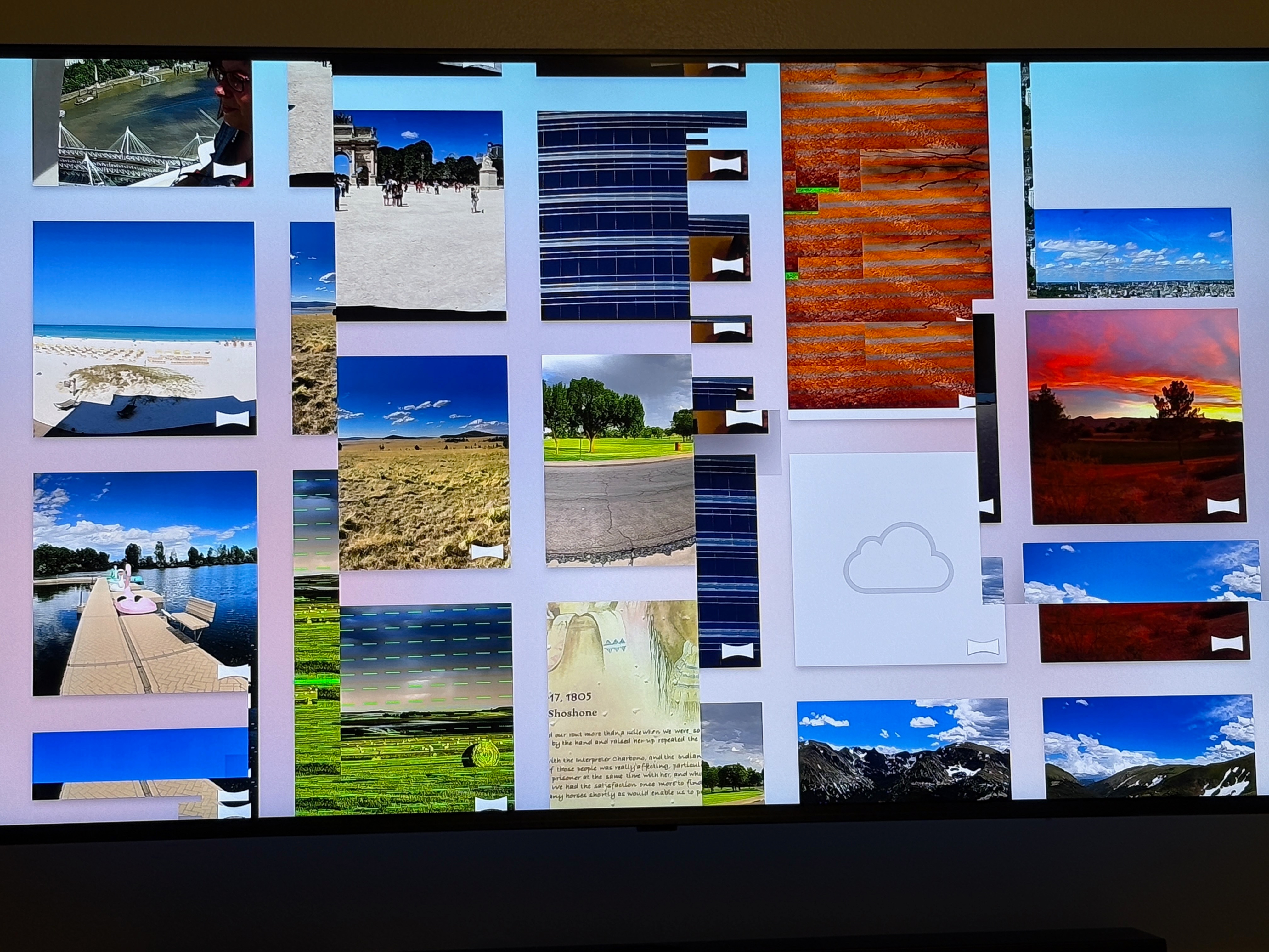 I have an AppleTV Gen 3 with tvOS 26.1 and an LG TV. I am having trouble with the Photos app. If the photo was taken with my phone, it appears normal on the TV. If it's been processed through Lightroom, some (but not all) photos appear cut off, in 3 sections, or with green horizontal lines through the image. The app starts to stutter and shake, and a column appears on the right side of the images with partial, shaking images. The photos I'm having trouble with are .jpg files. The same images appear fine on the Photos app of my iPhone 16 and on my Mac mini, and appear fine when mirroring my iPhone to the AppleTV. Any ideas are appreciated.