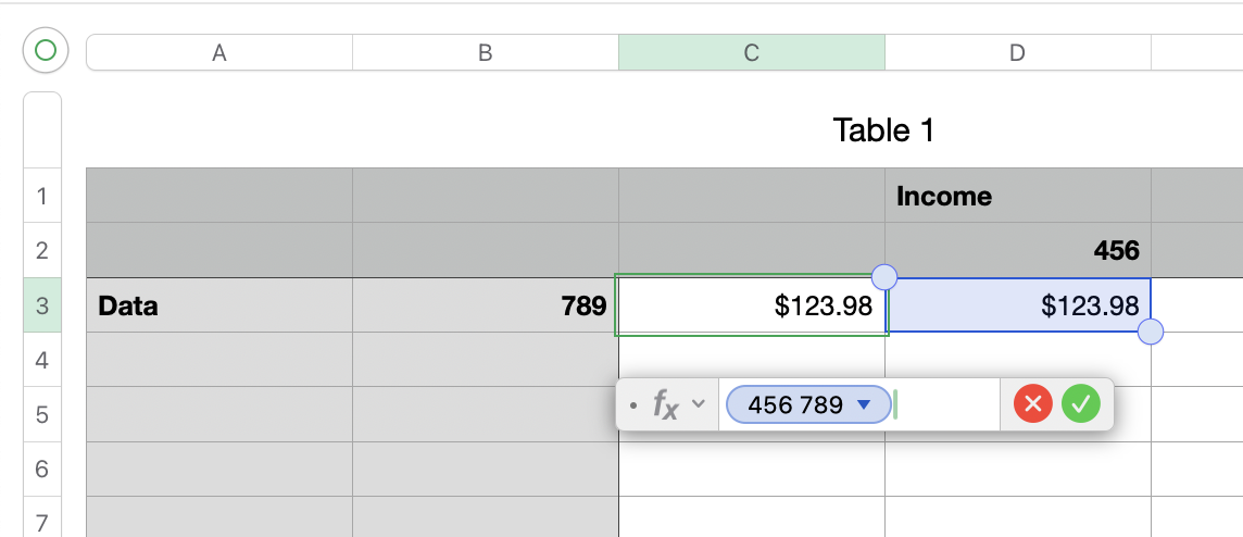 You have "use header names as labels" turned on. The references in your formulas will use the header names, not the alphanumeric columns and rows. Without knowing what cells are being referenced and seeing the table and the headers of the tables that have the referenced cells, I can only assume the references are correct. For the first one, you might be seeing numbers in the cell reference because the table with the referenced cell has more than one header row and header column and those other headers have numbers in them. If there is more than one header row, the reference will use the lowest one. If there is more than one header column, it will use the rightmost one. See my simple example below for cell C3 that is referencing cell D3.