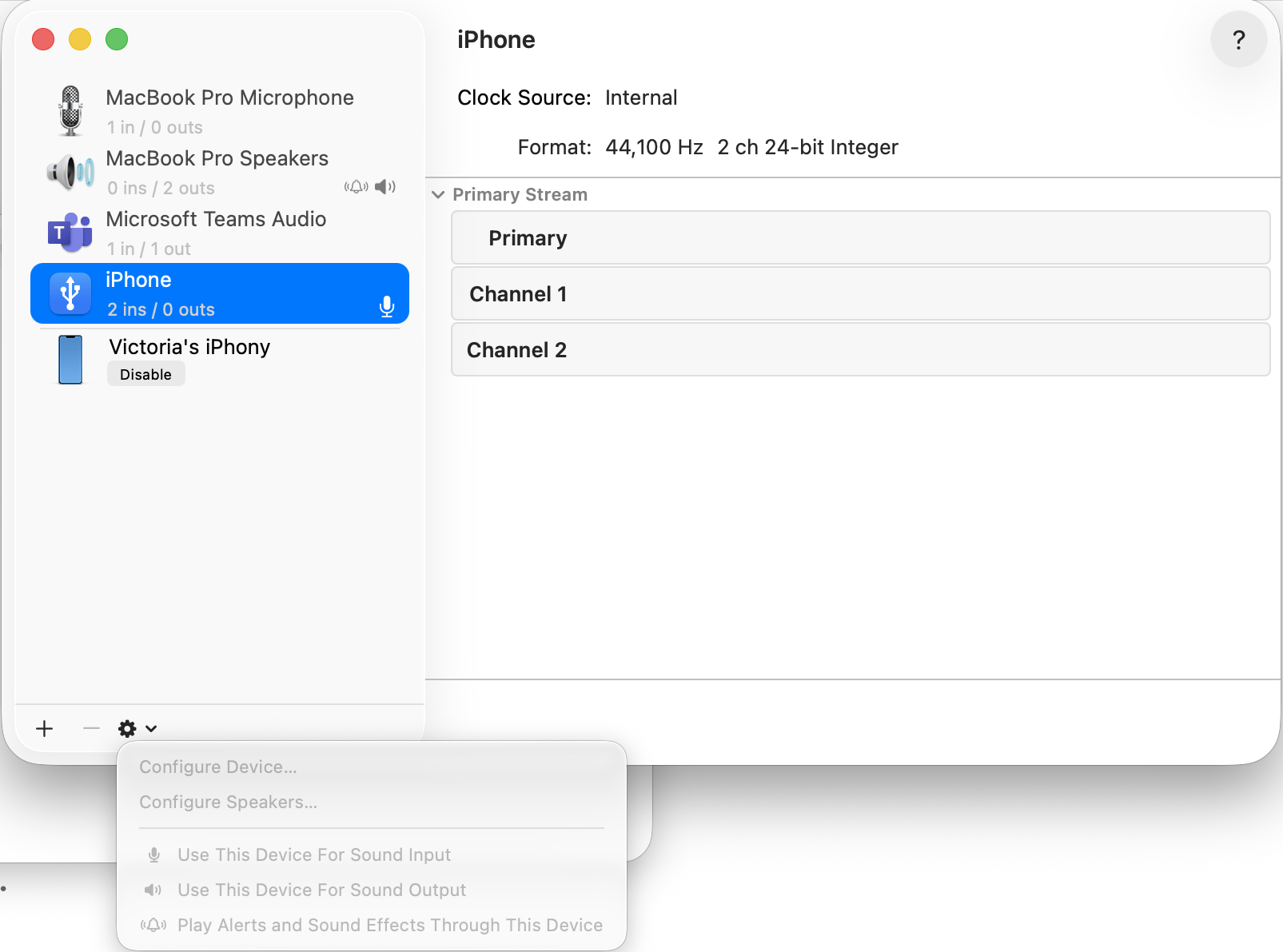When I go to Audio MIDI Setup and enable the iPhone 13, this works, but when I click the gear at the bottom to configure the device, everything is grayed out, as shown in the image.