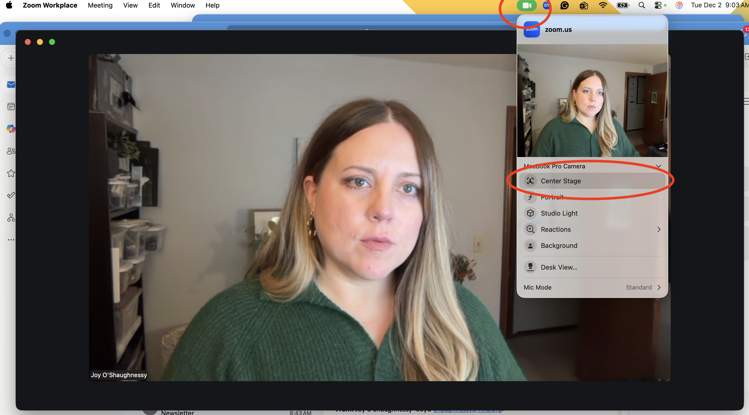 - Click the green camera icon, then uncheck “Center Stage.”