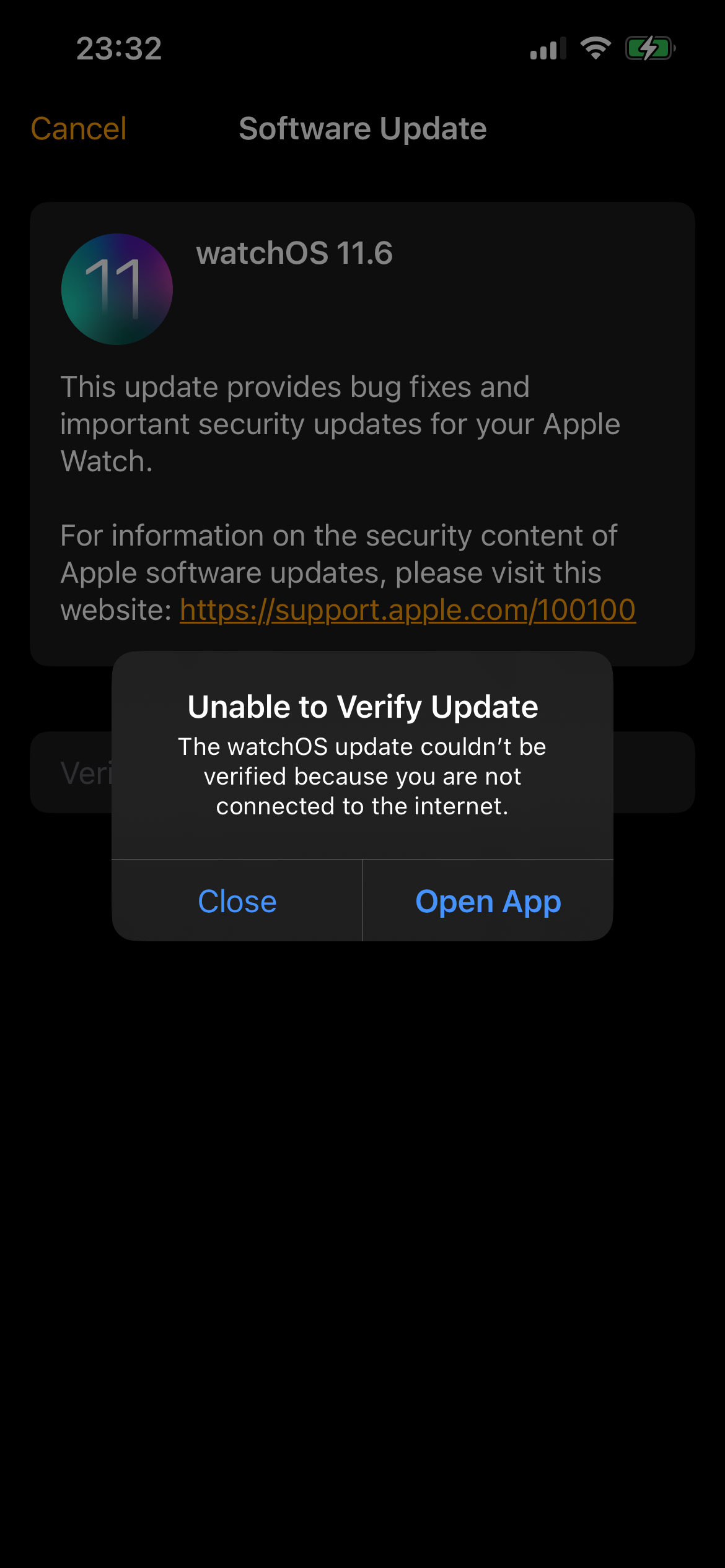 If "Close" is pressed, it simply exits the app and the update process; if "Open App" is pressed, it just reloads the app, and once you tap to update again, the same error appears, looping endlessly. The watch and the phone are clearly connected to the internet, so that is definitely not the issue even though the message suggests it is.