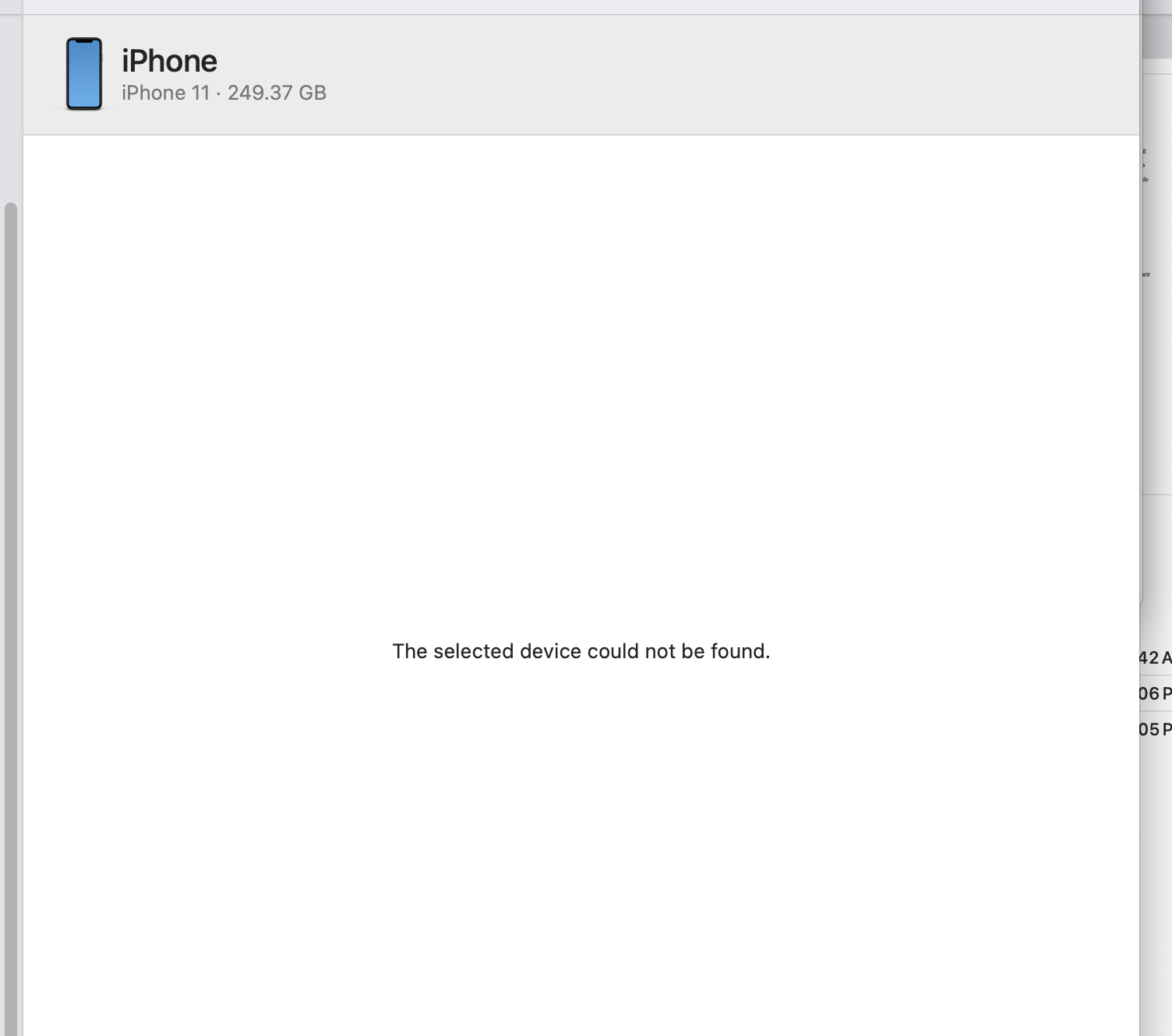 When I plug the phone in, Finder shows the phone in the sidebar and the phone charges, but Finder whirls while it searches for the phone and eventually returns the error "The selected device could not be found." If I unplug the phone without ejecting it from the finder, the laptop does not complain/warn that I did it wrong. Meanwhile, in Photos, the laptop does see the photos on the phone and allows me to import/delete them.