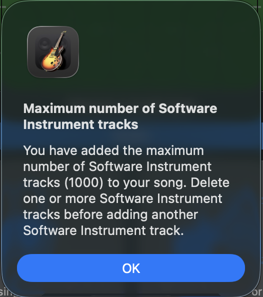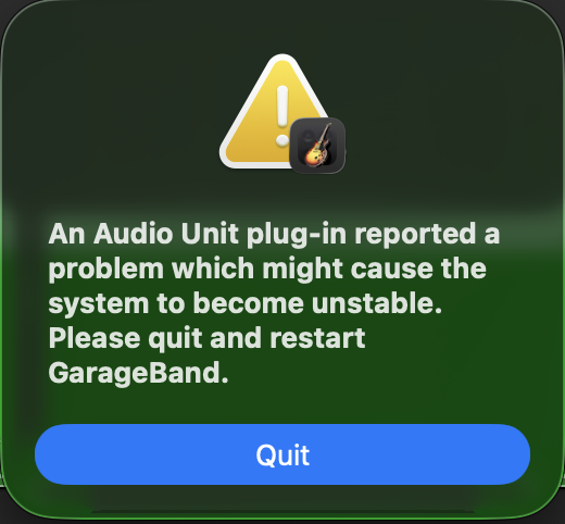 I was making a project in GarageBand using my own recorded sounds by adding a plugin ( Plugins --> Apple --> AU Sampler --> Stereo ) and had done this for four different tracks, ( each with a different plugin ), When suddenly I get this message: