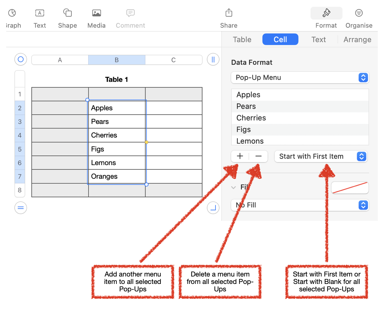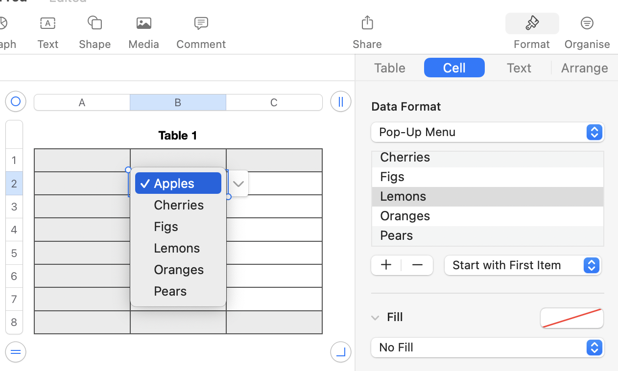 3. Format as pop up menu. All of the cells will be pop up menus that include all the items in the order they appear in the table.