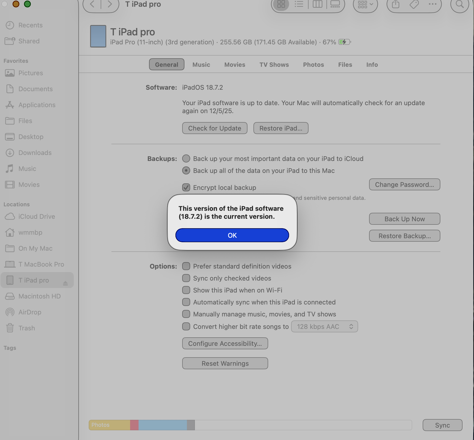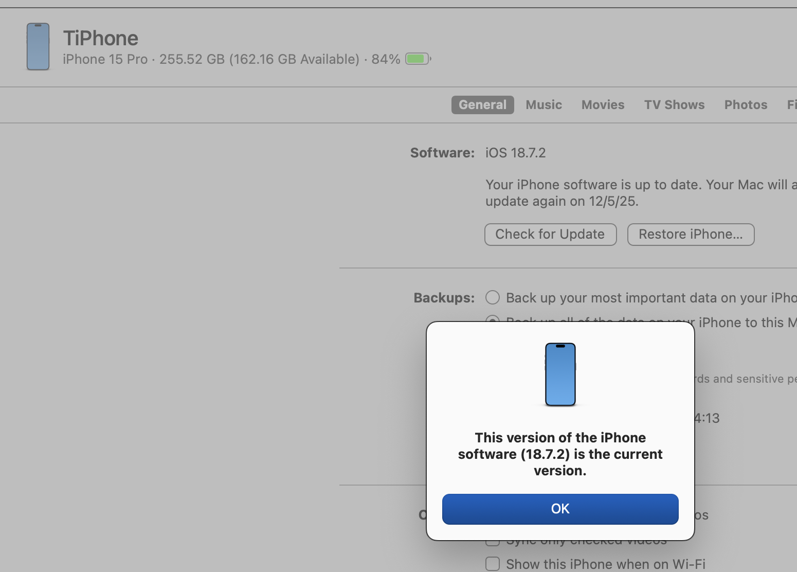 cant update ipone - I have an iPhone 15 pro that I back up to MPB , etc., using finder & cable. Now im trying to update iPhone to ios26 and get this: