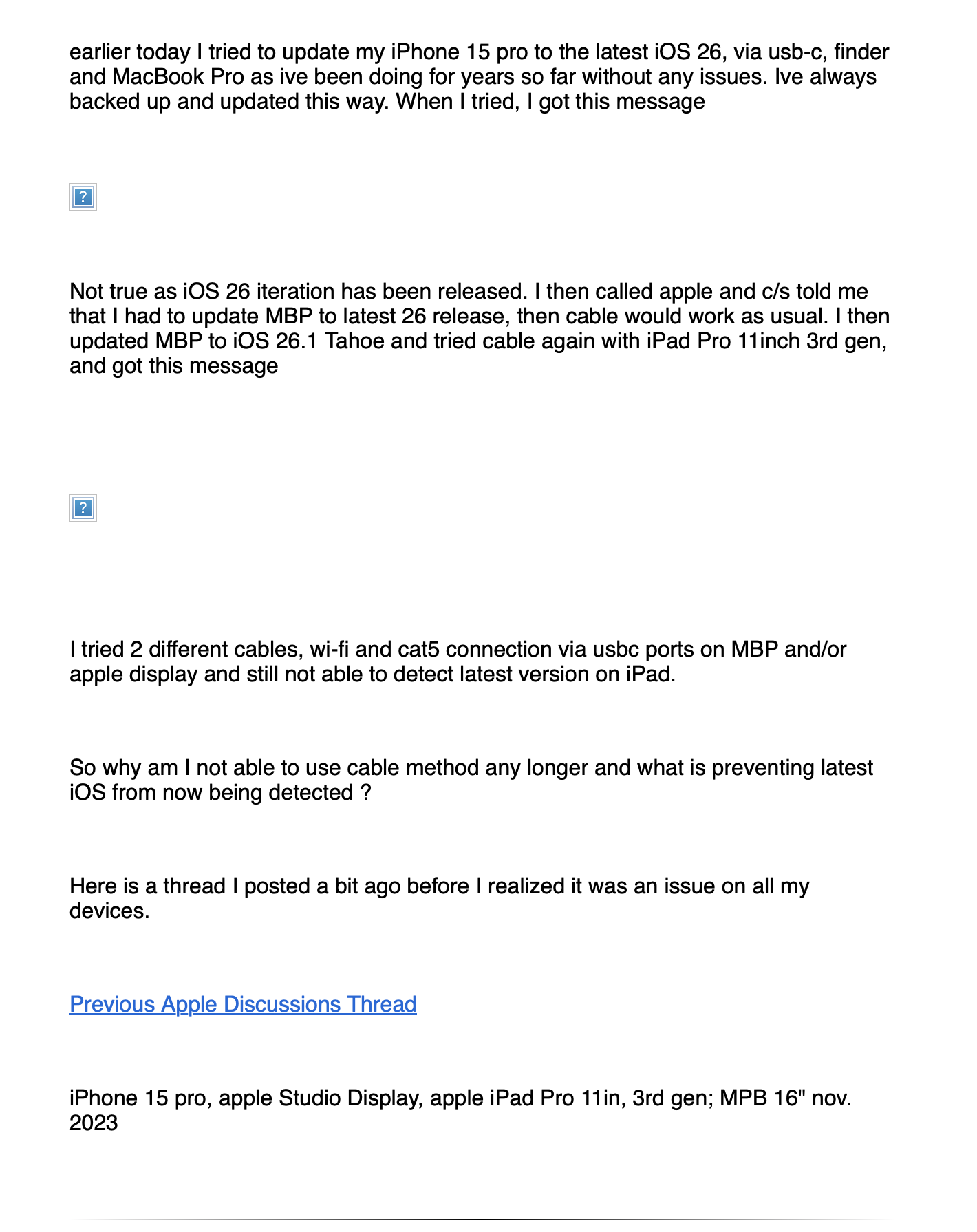 Apple support says I cant update via cable w/ Mac unless I update MBP to iOS 26 1st.