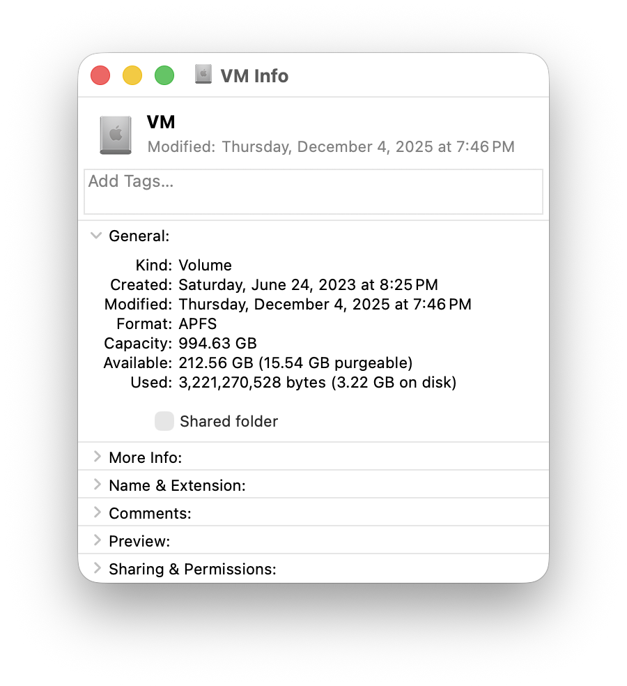 /dev/disk3s6      995G   3221M    197G     2%       3  1.9G    0%   /System/Volumes/VM