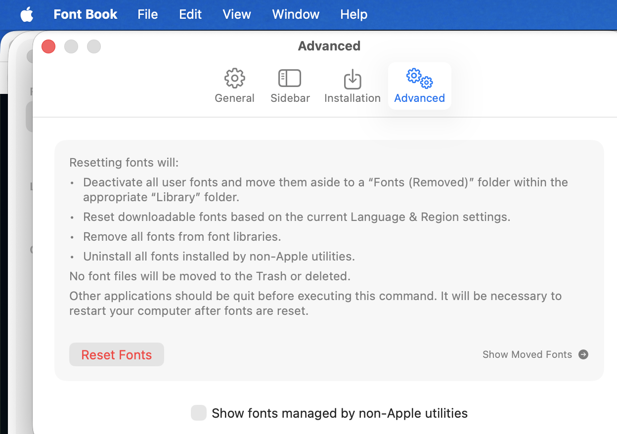 - Font Utility -> Settings -> Reset Fonts -> Reboot system. The problem persists.