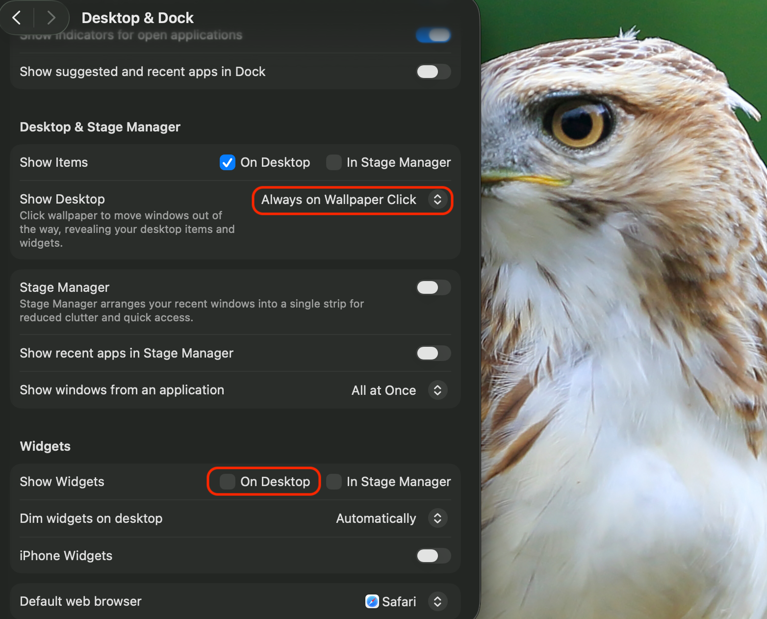 For example, with Show Desktop set to Always on wallpaper click and show widgets on desktop off, the widgets don't normally show up but if I click on the wallpaper all the open app windows move aside to reveal the desktop and the files on it, and the widgets then show up.
