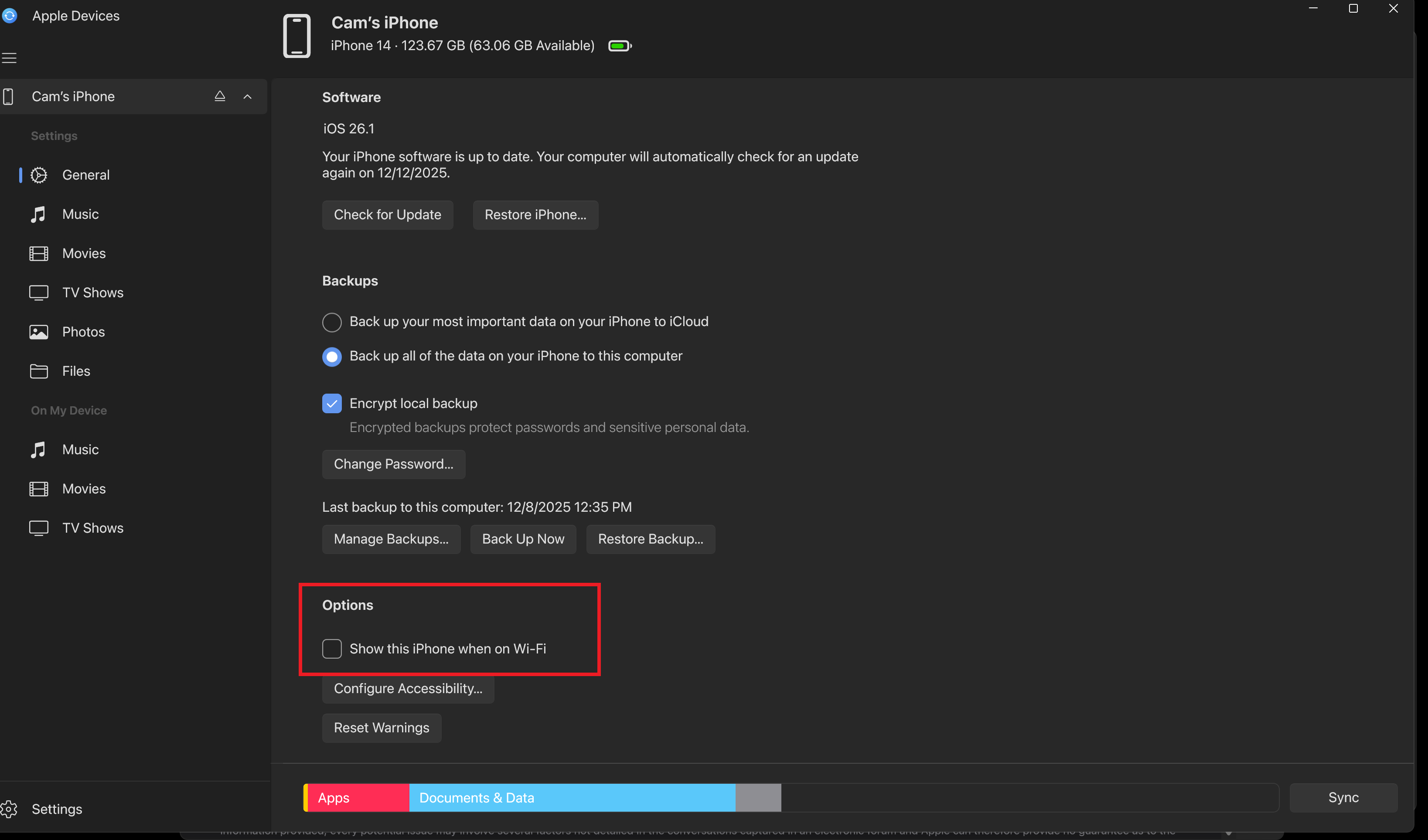 Apple Devices app for Windows 11 fails to enable 'Show this iPhone when on Wi-Fi' feature after OS reinstallation