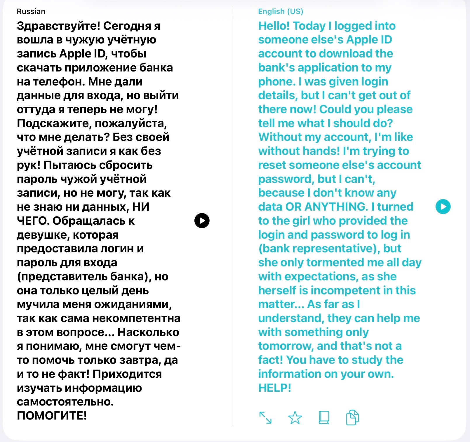 Здравствуйте! Сегодня я вошла в чужую учётную запись Apple ID, чтобы скачать приложение банка на телефон. Мне дали данные для входа, но выйти оттуда я теперь не могу! Подскажите, пожалуйста, что мне делать? Без своей учётной записи я как без рук! Пытаюсь сбросить пароль чужой учётной записи, но не могу, так как не знаю ни данных, НИ ЧЕГО. Обращалась к девушке, которая предоставила логин и пароль для входа (представитель банка), но она только целый день мучила меня ожиданиями, так как сама некомпетентна в этом вопросе... Насколько я понимаю, мне смогут чем-то помочь только завтра, да и то не факт! Приходится изучать информацию самостоятельно. ПОМОГИТЕ!