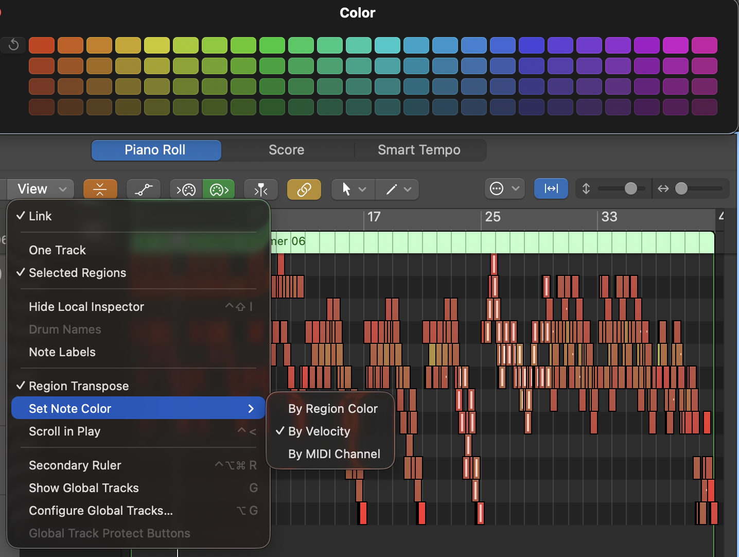 How do I change color of individual notes in the Piano Roll (Logic Pro for Mac)? By default, under View ➡️ Set Note Color it's set to By Velocity. But I'm working on a pretty complex MIDI sequence and I find myself wanting to color-code the notes to make it easier to differentiate different parts at a glance. I open the "Color" panel and select some notes, but clicking on a color in the color panel doesn't change the note colors. Any suggestion about how to color code notes in the Piano Roll?