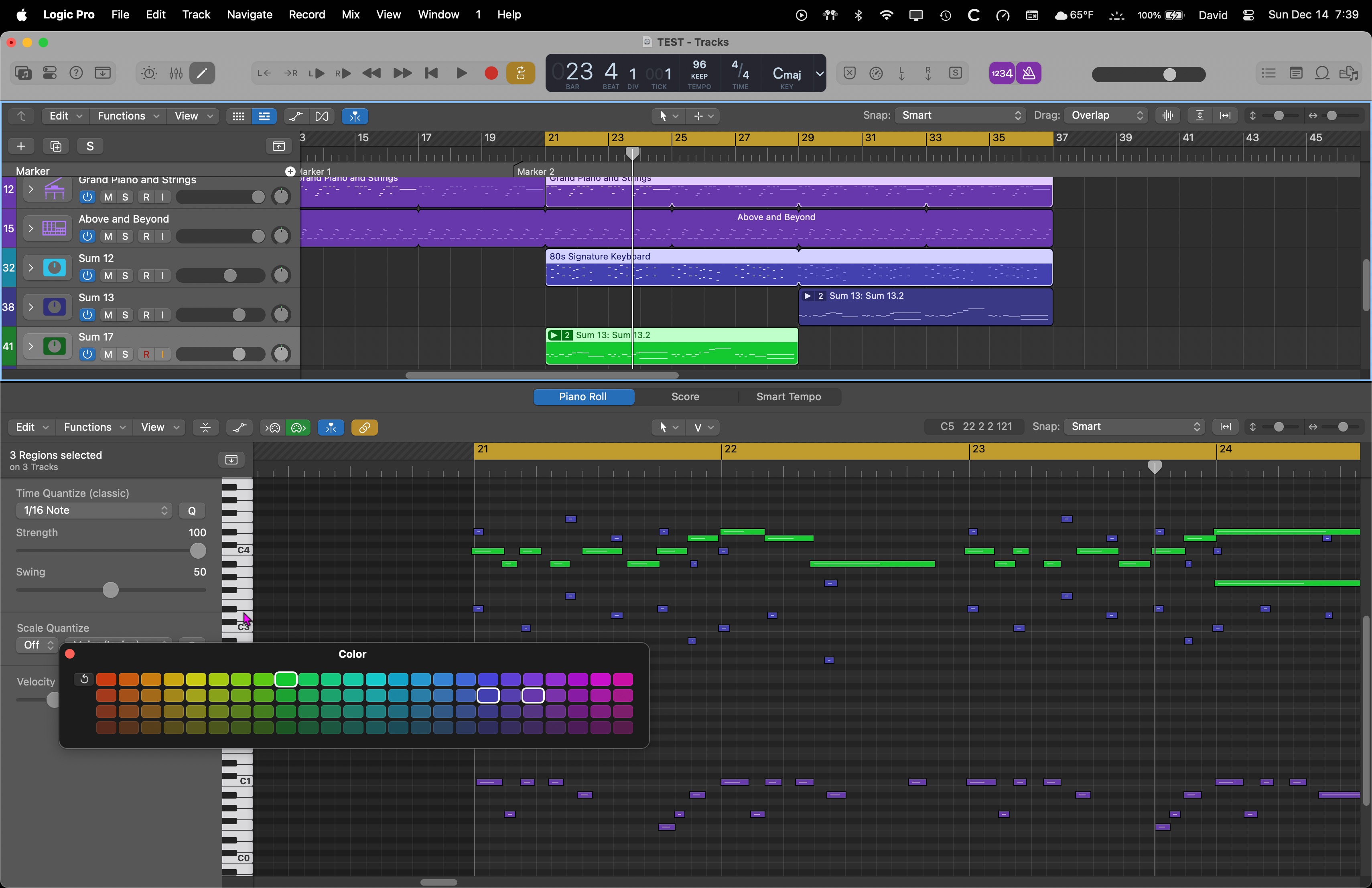 Logic Pro Piano Roll: How to color code notes?