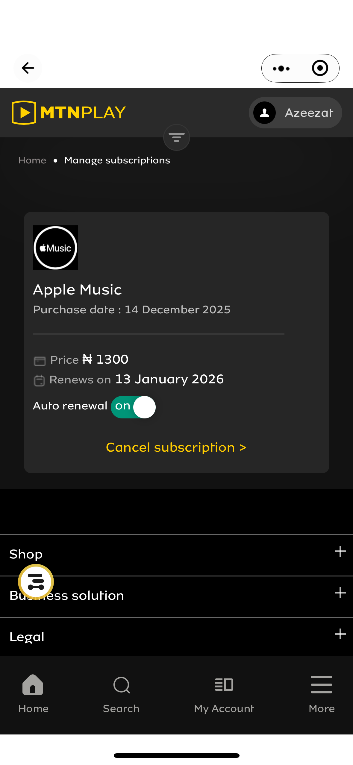 My Apple Music subscription was paid with MTN carrier billing in Nigeria. MTN deducted ₦1,300 and shows the subscription active until January 13, 2026, but Apple Music is locked and not showing under Subscriptions. how do i resolve this issues