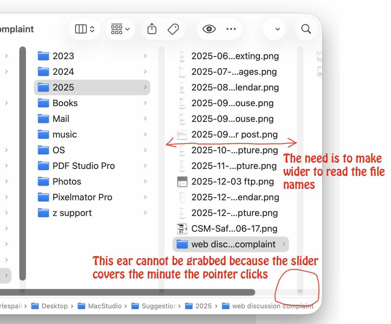 Tahoe 26.2 completed yesterday and a new issue not in 26.1 - when viewing folder contents in column format. The column window has the slider at the bottom covering the ears for stretching the column width to aid in reading long file names. Stretching to the right displays more columns, but the slider covers and prevents stretching. Probably a bug, but anyone have a workaround?
