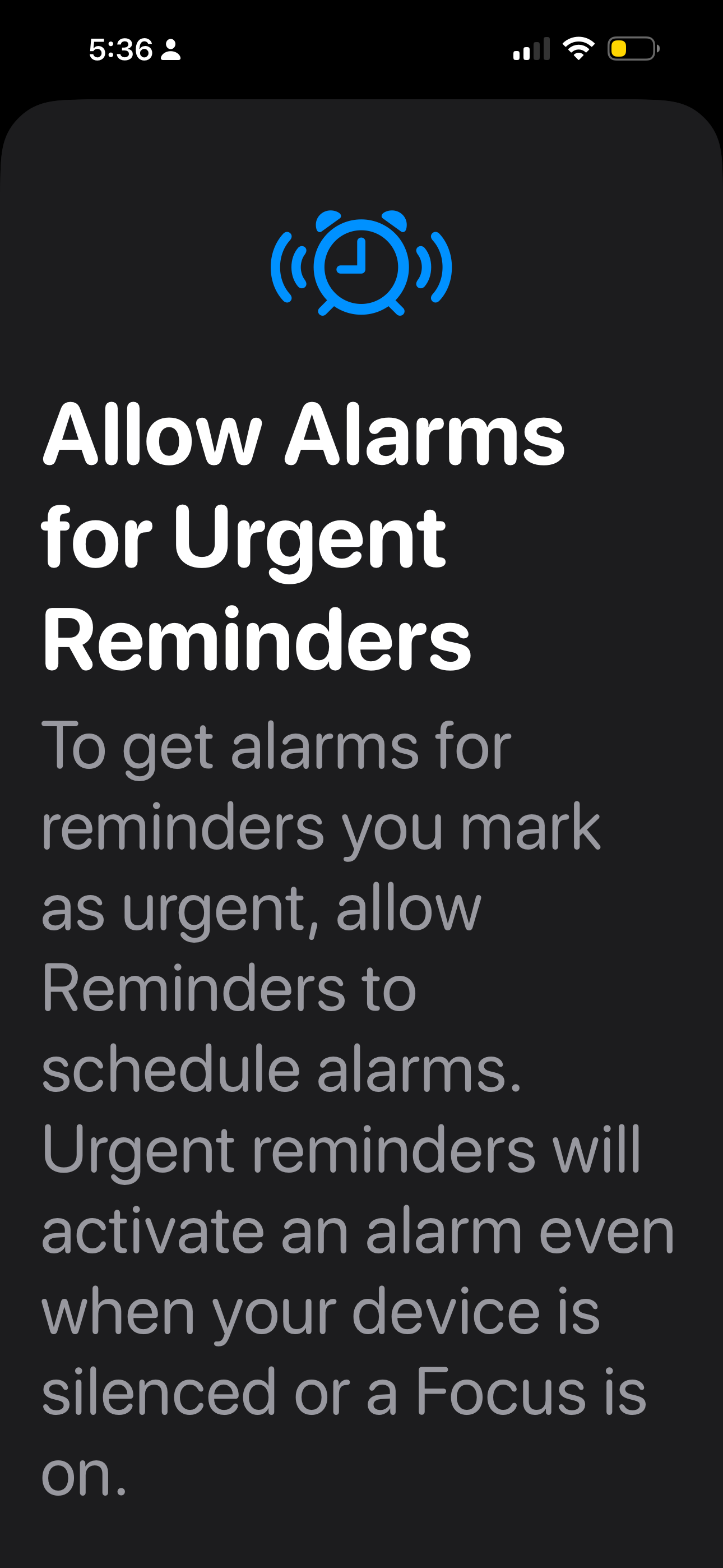 iPhone 15 Plus running 26.2. When I try to open Reminders, I get a splash notification about Allowing Alarms for Urgent Reminders. It won’t let me dismiss it to get to my Reminders no matter what I try to