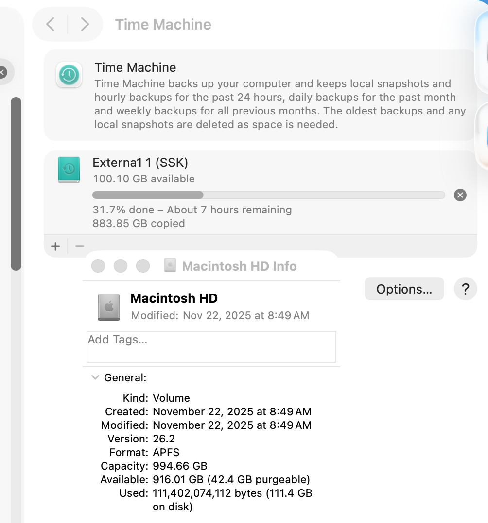 - After an initial set up 2 days ago, I formatted an external 1.02TB SSD as a Time Machine Backup, and performed the first back up, which showed up as "2025-12-18-141539" (15.6GB) Time Machine Backup"