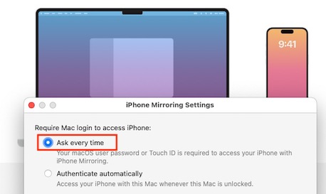 To fix that, open the iPhone Mirroring App on your Mac, go to Settings and change the setting to "Ask every time"