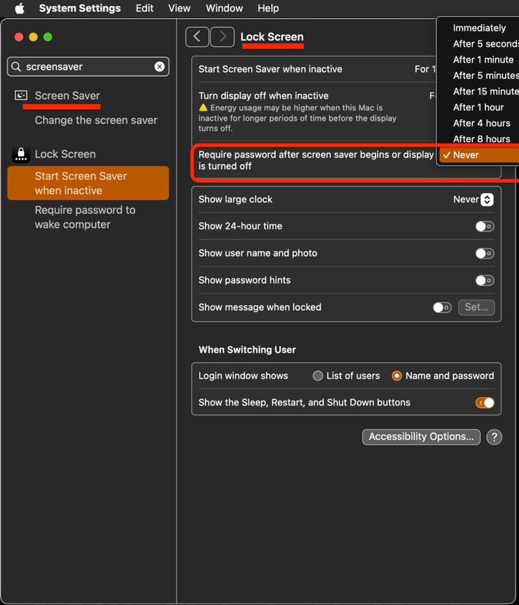Disable password after screen saver begins