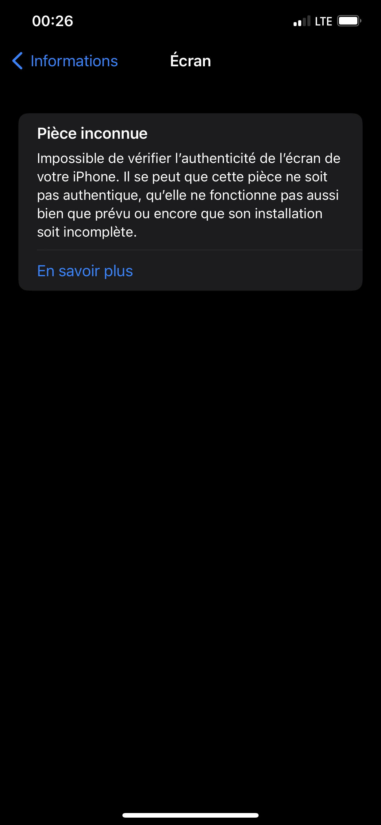 Soit la pièce pourrait être défectueuse, soit elle a été remplacée par une pièce qui n'est pas d'origine. Faites vérifier votre iPhone dans un Apple Store ou un centre de services agréé Apple.