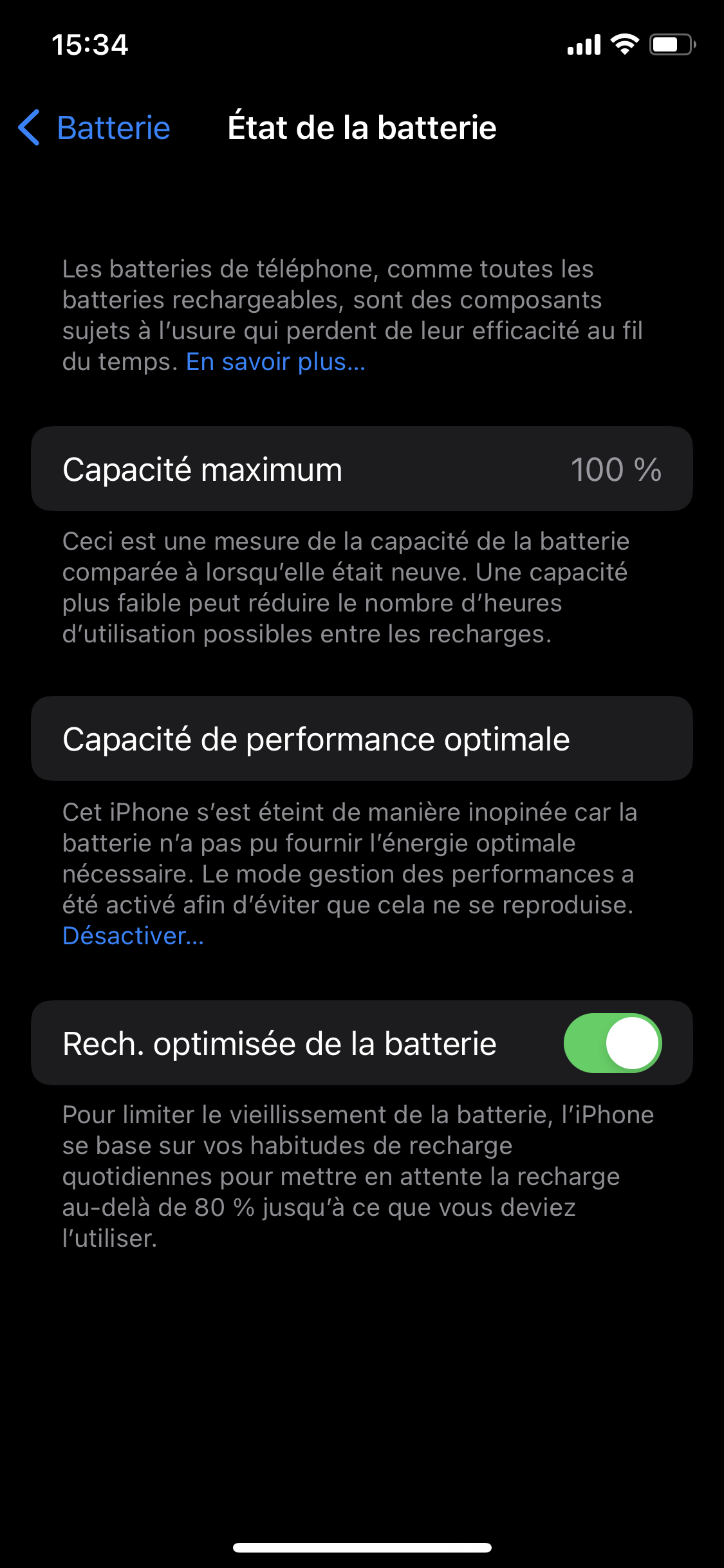 bonjour mon iPhone X s’éteint à 50 % puis impossible de le rallumer. Après qu’il soit éteint je le charge et il s’allume directement à environ 12% (le nombre varie). Je suis allé voir dans l’état de la batterie mais la capacité maximum est affichée à 100%
