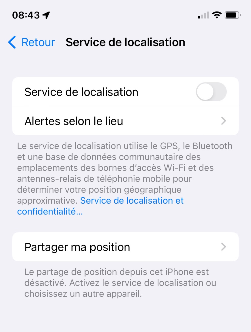 Je rencontre un souci avec la localisation. Bien que tout soit désactivé, la flèche de localisation apparait. Curieux… Que faire ? Capture à l’appui.