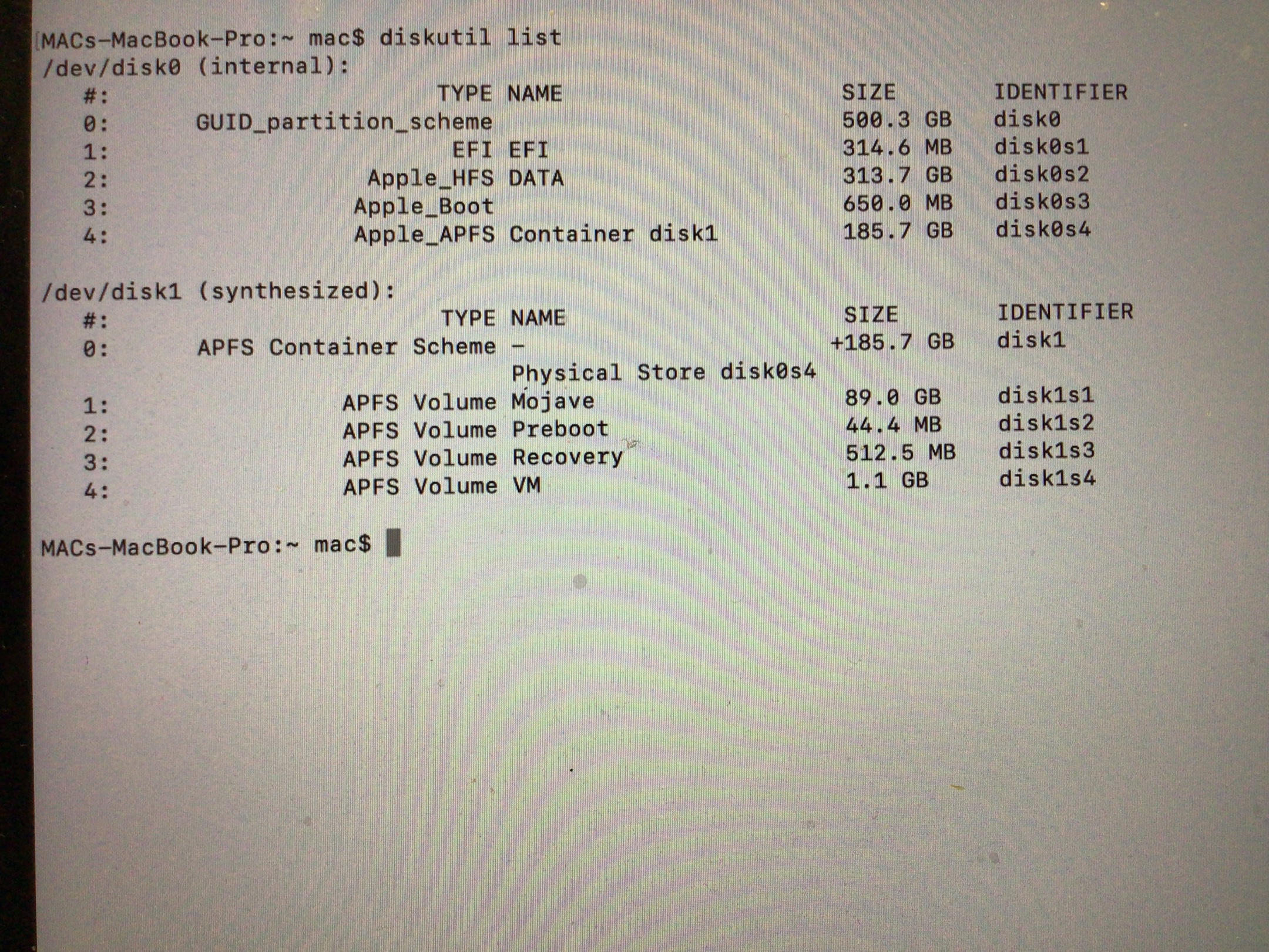 Voila j'ai commence par executer la commande diskutil list et voila résultats :