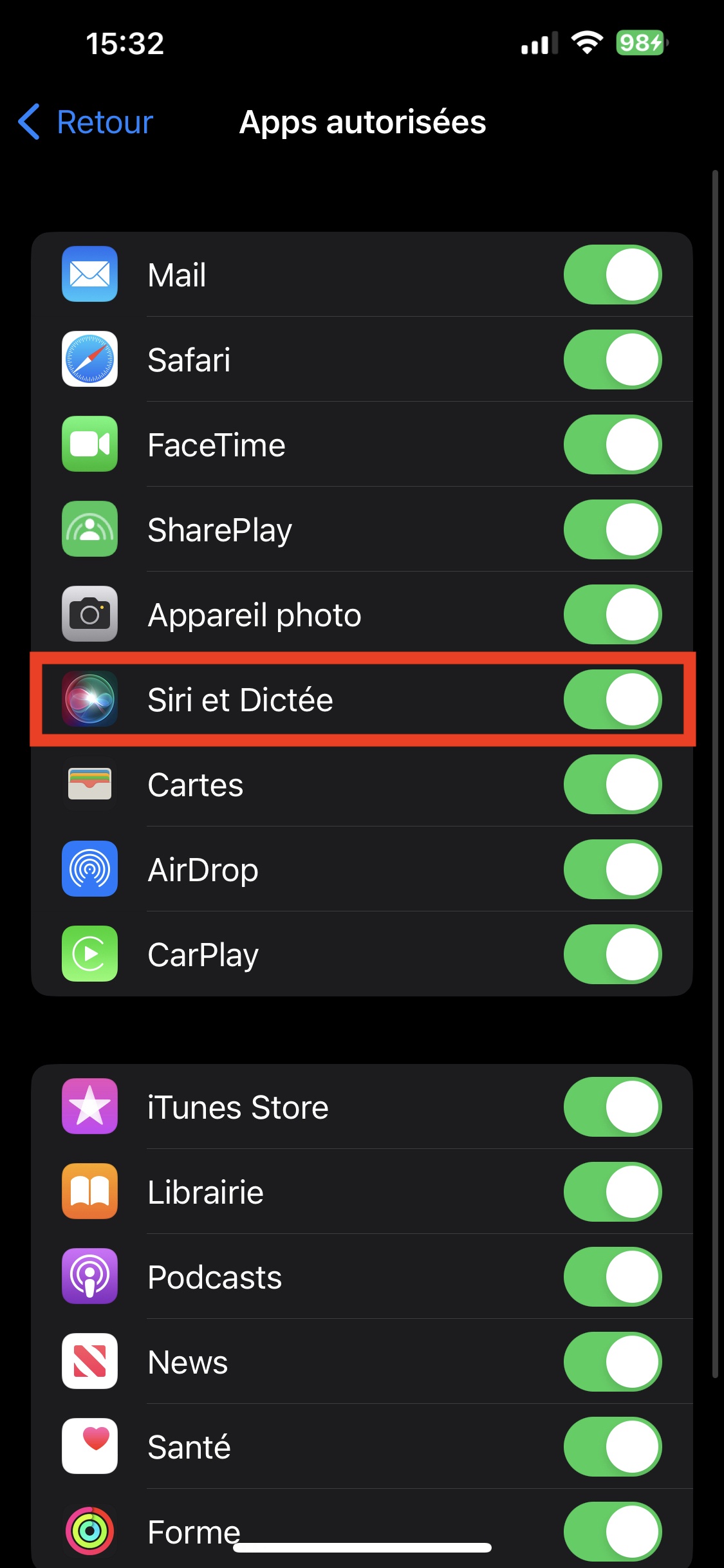 Si la rubrique Siri et recherche est absente de l'app Réglages de ton iPhone 14 Plus, il est probable que tu aies activé une restriction. Pour résoudre ton souci, je te conseille d'aller dans Réglages > Temps d'écran > Contenu et confidentialité > Apps autorisées et de vérifier que tu as bien autorisé Siri et Dictée.