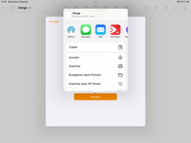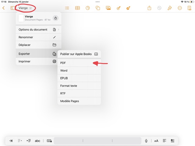 Pour partager un document .pages en .pdf, il suffit de cliquer sur le nom du fichier (lorsqu’il est ouvert dans Pages) puis de cliquer sur Exporter puis sur PDF