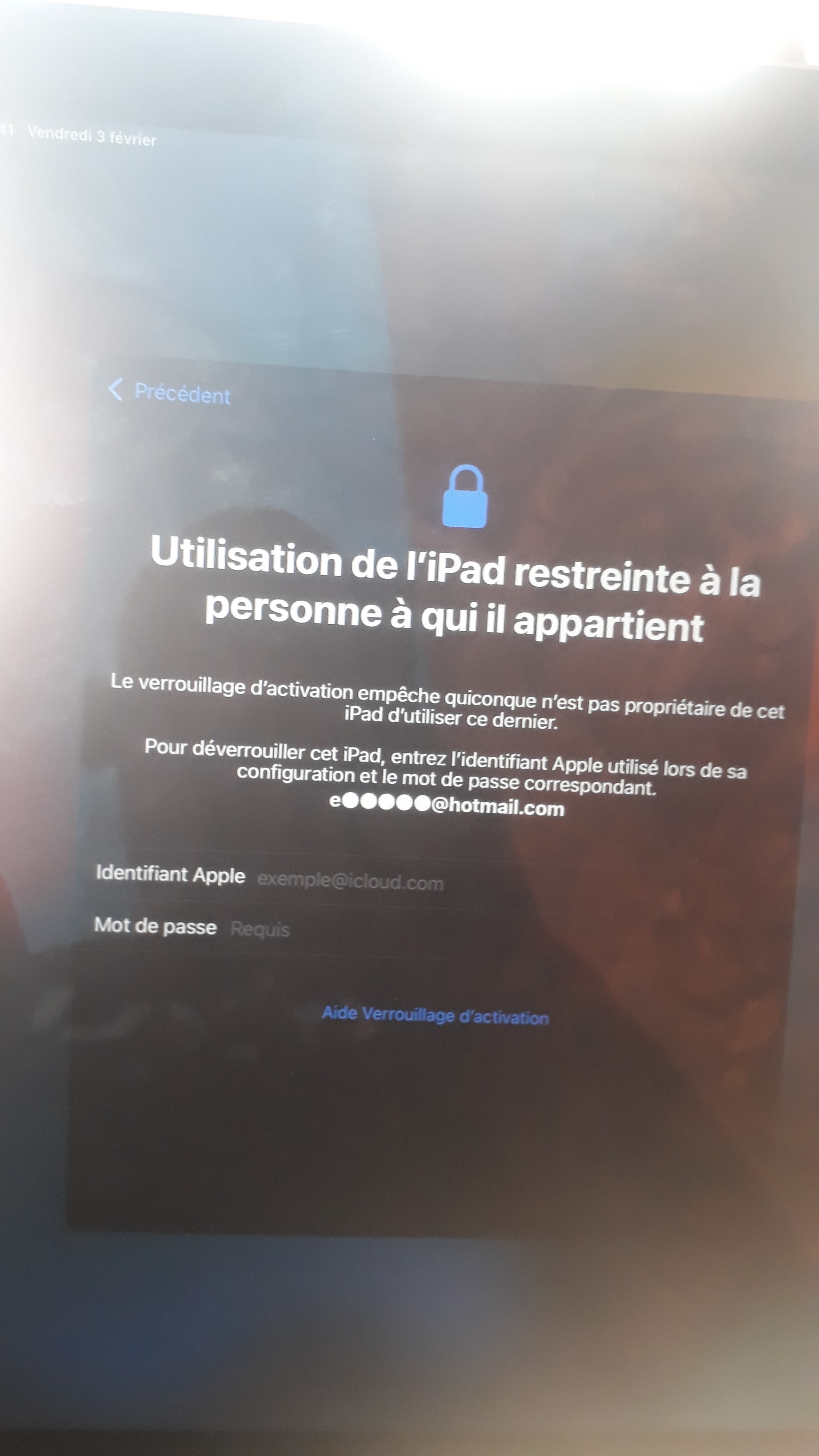 L'iPad affiche que le verrouillage d'activation est activé > cela indique que l'appareil est lié à l'identifiant Apple du propriétaire, le propriétaire précédant de l'iPad n'a pas supprimé l'iPad de son compte Apple, le jour où l'ancien propriétaire supprimera l'iPad de son compte Apple là vous pourrez le réutiliser/ le configurer avec un autre compte Apple.