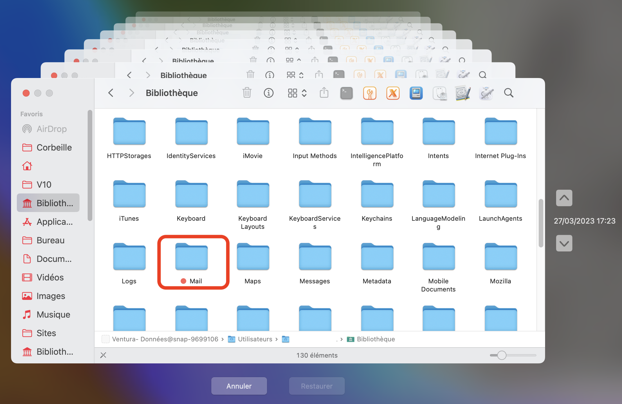 Après la mise à jour de mon OS vers Catalina, je viens de rouvrir Mail avec laquelle je gère mes messages depuis des années - serveur Orange en IMAP - et tous mes dossiers Mail ont disparu. Je ne trouve aucun dossiers de stockage Mail dans la bibliohèque. C'est très ennuyeux car il s'agit en grande partie de ma boite pro !! J'ai fais une sauvegarde TimeMachine avant la mise à jour. Est-ce que je peux réimporter mes dossiers Mail depuis cette sauvegarde ? SOS