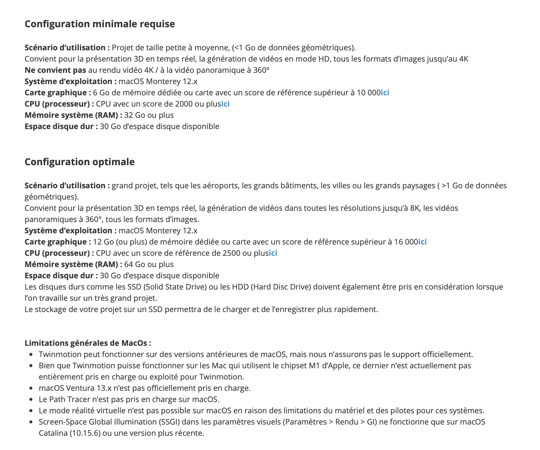 Je me permet de vous laisser ce message car j'utilise les logiciels Archicad et Twinmotion dans le cadre de mon travail et j'aimerais pouvoir travailler avec la dernière version de Twinmotion ( 2023.1) mais je craint que mon Mac ne soit pas assez puissant. Actuellement, je ne peux même pas utiliser la version 2022 car le logiciel ne fait que de planter dès que mon fichier commence à être un peu plus gros ( après 2/ 3 heures de travail).
