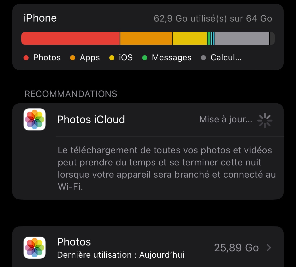 j’ai souscrit a un abonnement icloud+ (200) car mon stockage était plein, maintenant que j’ai de l’espace mes photos (14000) ne veulent pas se télécharger. Ils précise qu’une attente est possible le temp de tout le téléchargement mais cela fait 7 jour que l’icône “photos icloud” dans “stockage iPhone” tour en me disant “mise a jour” 8 JOURS. Pourquoi faire payer un abonnement pour qu’il soit inutile. (Mon téléphone et branché et en wifi)