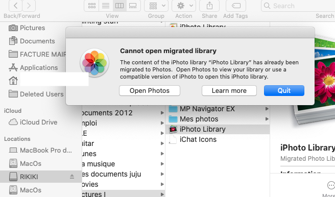 Je viens de migrer une iPhoto Library (photothèque) située dans mon disc dur externe, car je voulais consulter les photos qu'il y avait dedans.