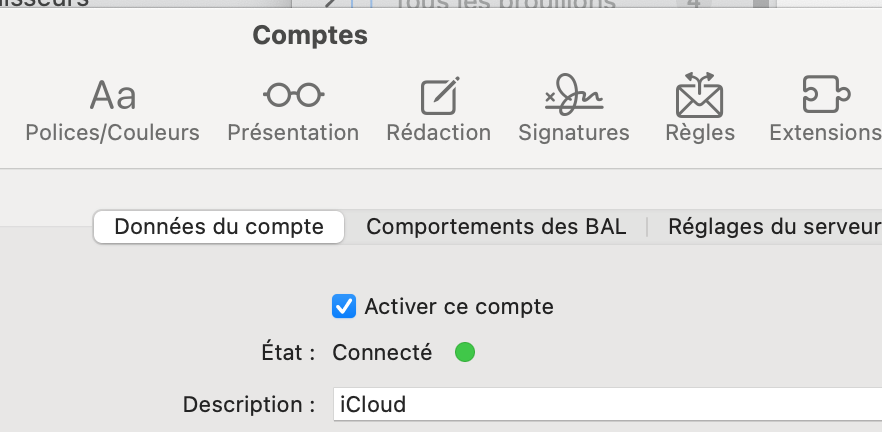 Avez-vous vérifié dans Mail>Réglages>Comptes si le compte est bien activé et connecté ?