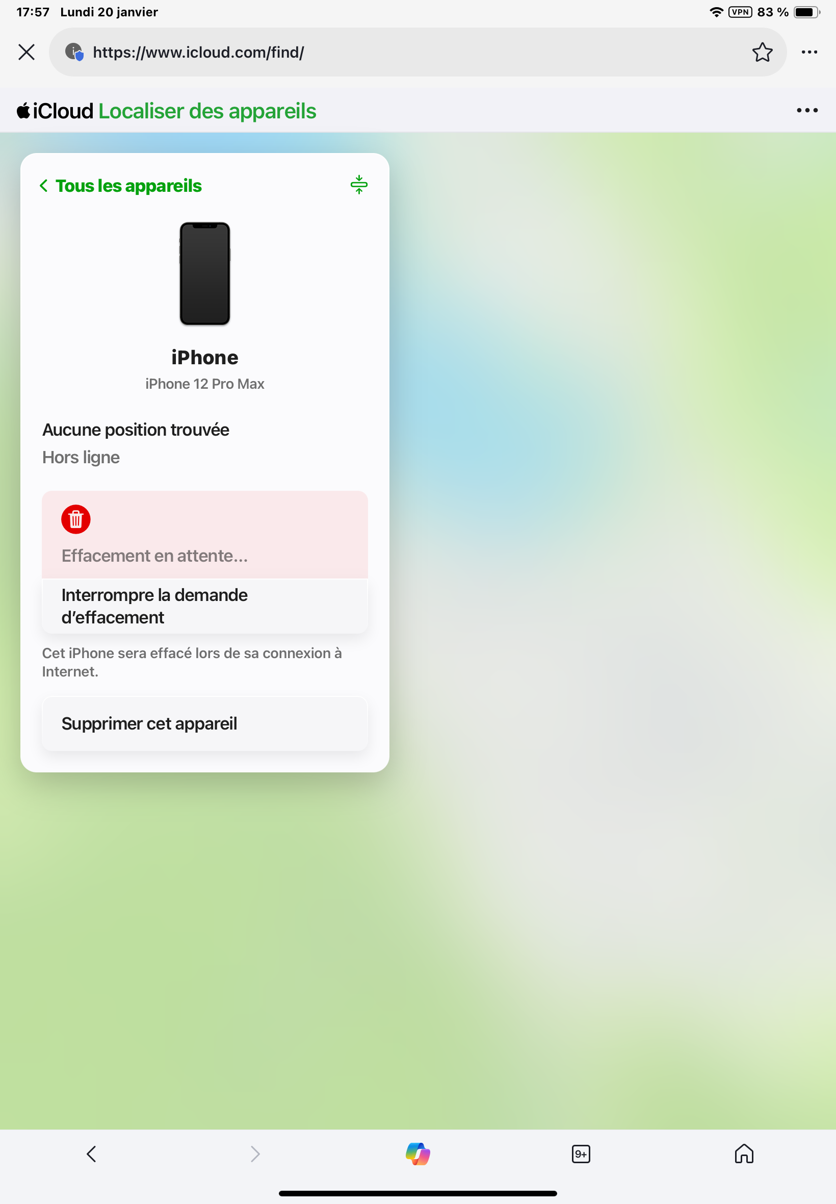 Mon iPhone a été volé le 20 janvier 2025 à Jakarta (Indonésie) et n’est plus récupérable. Sur mon application « Localiser » il se trouve toujours sur « effacement en attente », donc apparemment il n’a pas été remis en ligne. Dois-je le supprimer de mon compte iCloud, ou encore attendre ? Que suggérez vous ? ou quel est votre conseil ?